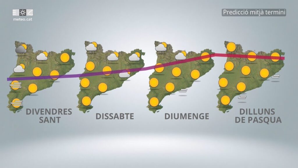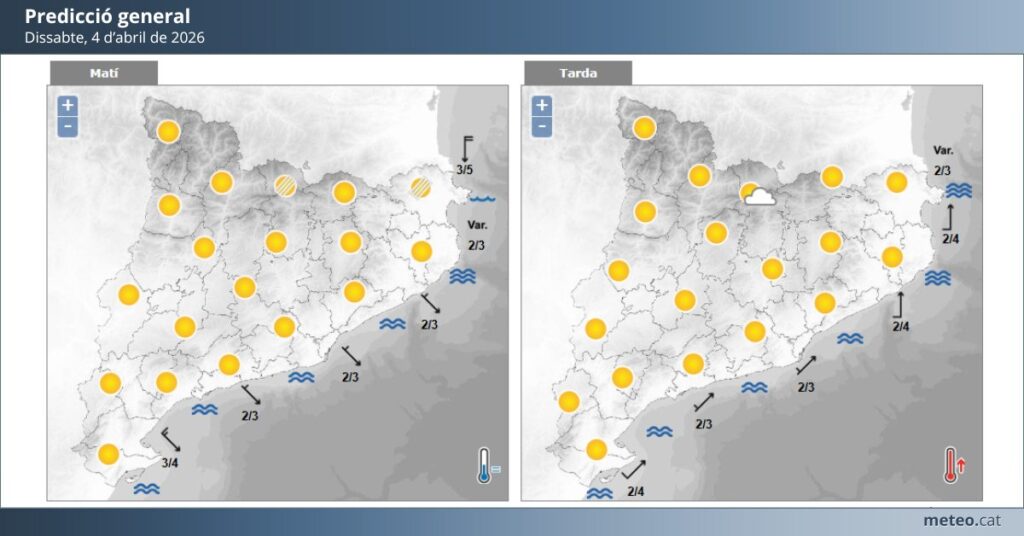 En canvi, diumenge el temps farà un lleuger gir cap a la inestabilitat. Els núvols guanyaran protagonisme al llarg del dia i no es descarta l’aparició de ruixats febles i puntuals. Tot i això, les temperatures es mantindran similars a les del dia anterior, amb un ambient suau propi de la primavera.