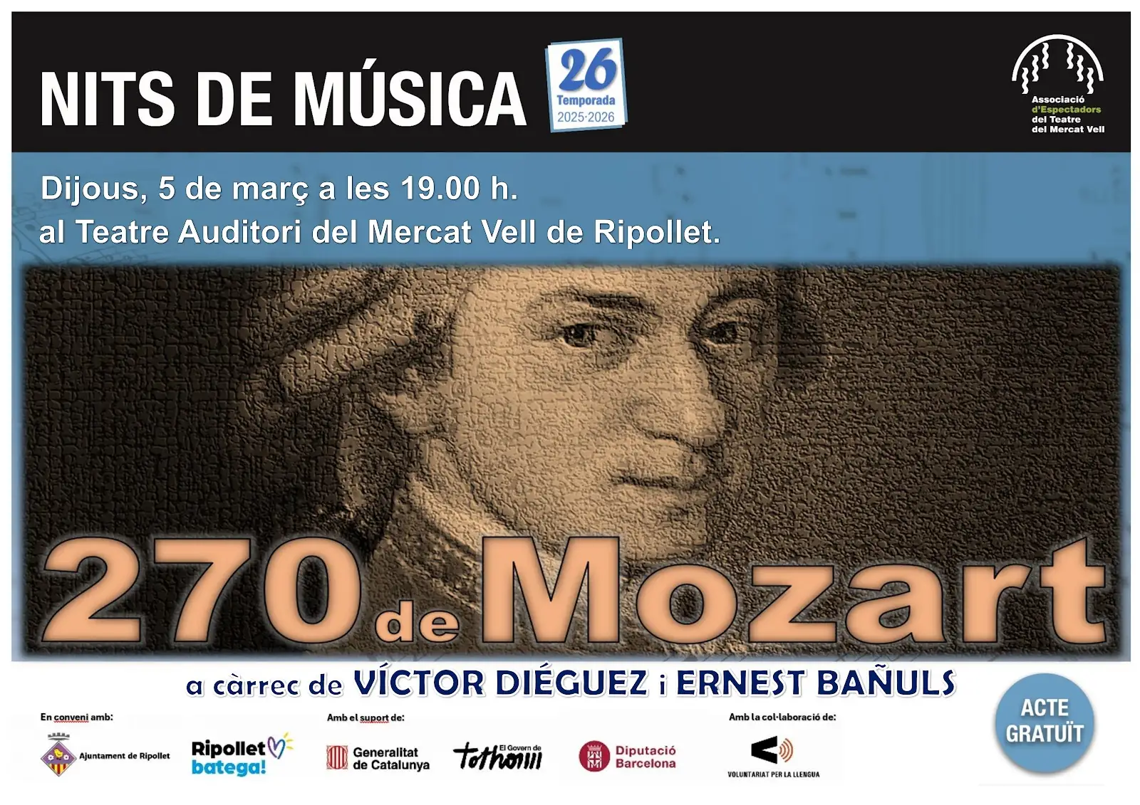 La 26a temporada del cicle Nits de Música 2025-2026 presenta una proposta dedicada a una de les figures cabdals de la història de la música clàssica. L’Associació d’Espectadors del Teatre del Mercat Vell presenta l’acte “270 de Mozart”, una sessió especial que retrà homenatge al compositor austríac en el 270è aniversari del seu naixement.