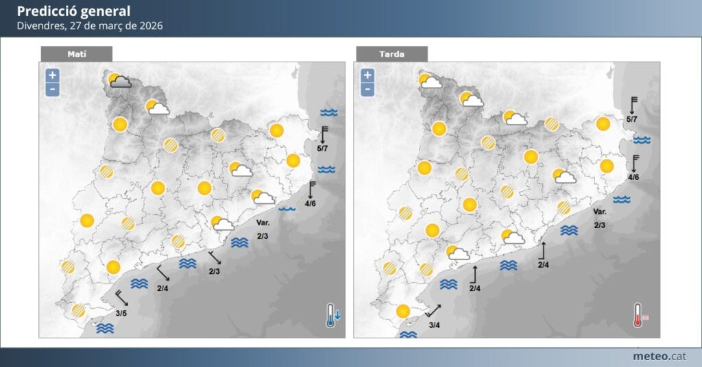 La jornada de divendres 27 de març estarà marcada per intervals de núvols i una atmosfera de caràcter primaveral però encara fresca. Les temperatures es mouran entre els 9 i 11 °C de mínima i els 15 a 17 °C de màxima, amb baixa probabilitat de precipitacions, tot i que no es descarta algun plugim puntual. El vent bufarà amb certa intensitat en alguns moments, reforçant la sensació de frescor.