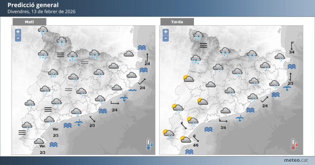 Segons les darreres prediccions, divendres 13 de febrer es preveu un dia amb núvols i pluja moderada al llarg de la jornada, amb temperatures que rondaran els 14 °C de màxima i 10 °C de mínima i un nivell de precipitació que pot arribar a 0,3 polzades (uns 7–8 mm) durant el dia. Les pluges seran més probables sobretot al matí i al migdia, tot i que el cel podria obrir-se una mica a la tarda. Aquest patró d’aigua coincideix amb un episodi de vent notable que està afectant tot Catalunya i que ha portat avisos oficials per ratxes fortes i impacte en sectors com el litoral i prelitoral de Barcelona.