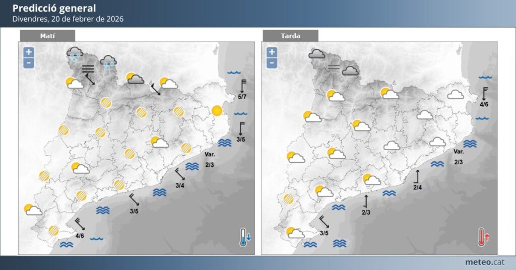 La jornada d’aquest divendres 20 de febrer, començarà amb temperatures mínimes d’entre 6 i 8 °C, en un ambient fresc a primera hora i amb possibles bancs de boira o boirina en zones baixes. Al llarg del dia, els termòmetres s’enfilaran fins als 16 °C de màxima, amb un cel variable dominat pels intervals de núvols.