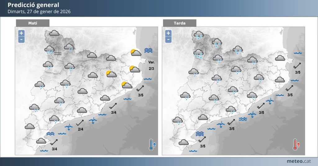 Per a dimecres 28 de gener, els mapes meteorològics mostren una continuïtat del patró de cel cobert, amb pluja dèbil o ruixats a primera hora del dia i núvols que predominaran sobre les clarianes. Les temperatures seran lleugerament més baixes que dimarts, amb màximes al voltant de 10 °C i mínimes que no baixaran gaire per sota dels 7 °C. El vent continuarà present, amb ratxes que podrien fer més perceptible la sensació freda.
