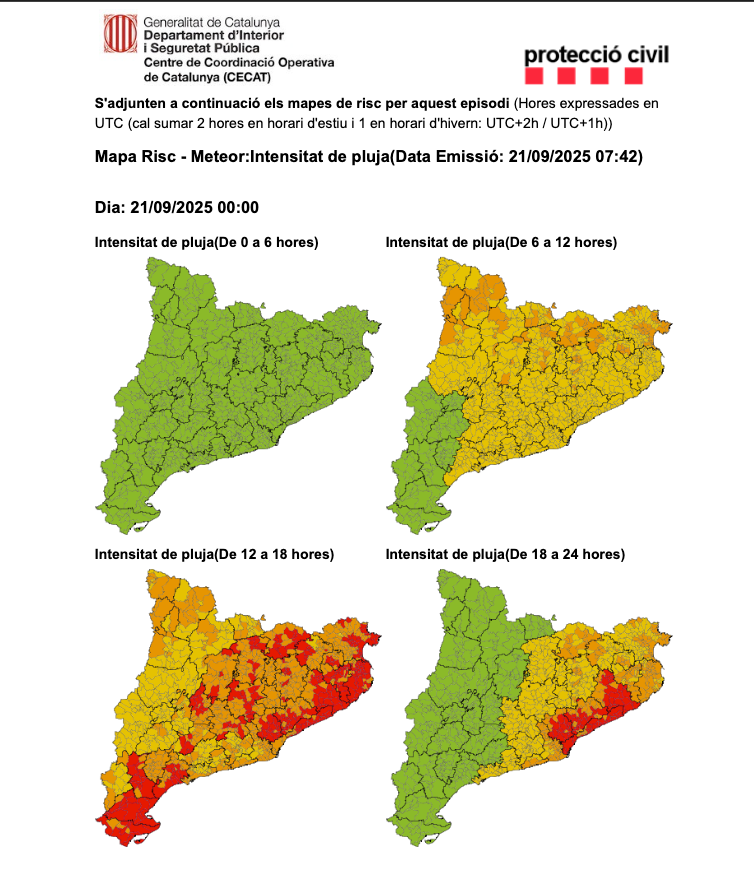Les precipitacions poden anar acompanyades de tempestes, calamarsa o pedra i ratxes fortes de vent, amb acumulacions locals que podrien superar els 50 mm. Protecció Civil recorda a la població que consulti les recomanacions de seguretat davant pluges intenses a interior.gencat.cat/inundacions i que segueixi l’evolució de la situació a través de les prediccions de meteo.cat i els canals oficials.