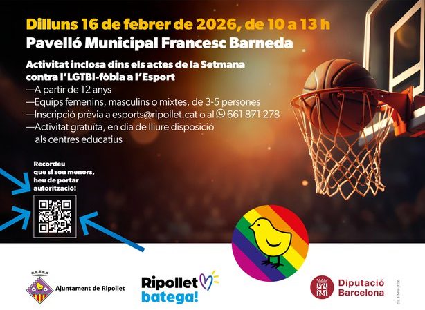 El pavelló municipal d’esports Francesc Barneda acollirà el pròxim dilluns, 16 de febrer, de 10 a 13 h, la Jornada de Bàsquet 3×3 + Concurs de Llançament, una proposta esportiva i educativa adreçada a infants i joves de 12 a 20 anys. L’activitat s’emmarca dins del projecte “Joventut Esportiva, Societat Activa” (JESA), impulsat per la Diputació de Barcelona, i forma part dels actes de la Setmana contra l’LGTBI-fòbia a l’Esport.