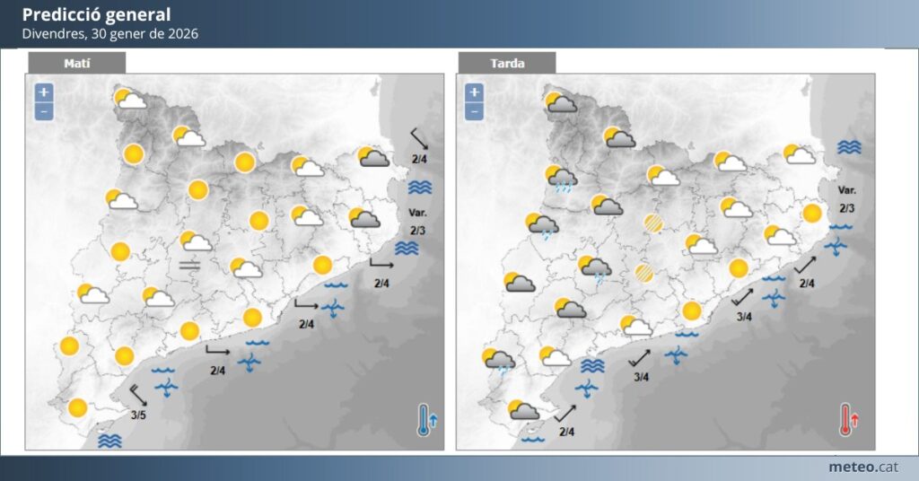 Dissabte 31 de gener de 2026 serà un dia amb temperatures fresques però suportables per a l’època, amb màximes al voltant de 13–15 °C i mínimes properes als 7 °C. El cel alternarà intervals de núvols i estones de sol, amb probabilitat molt baixa de precipitació, i el vent serà moderat, amb ratxes que poden fer sentir la sensació de fred.