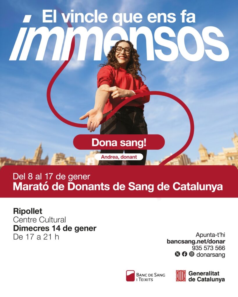A Ripollet, la pròxima captació de sang tindrà lloc el 14 de gener, de cinc de la tarda a nou del vespre, a les instal·lacions del Centre Cultural. Una nova oportunitat per demostrar que la solidaritat salva vides. No hi falteu.