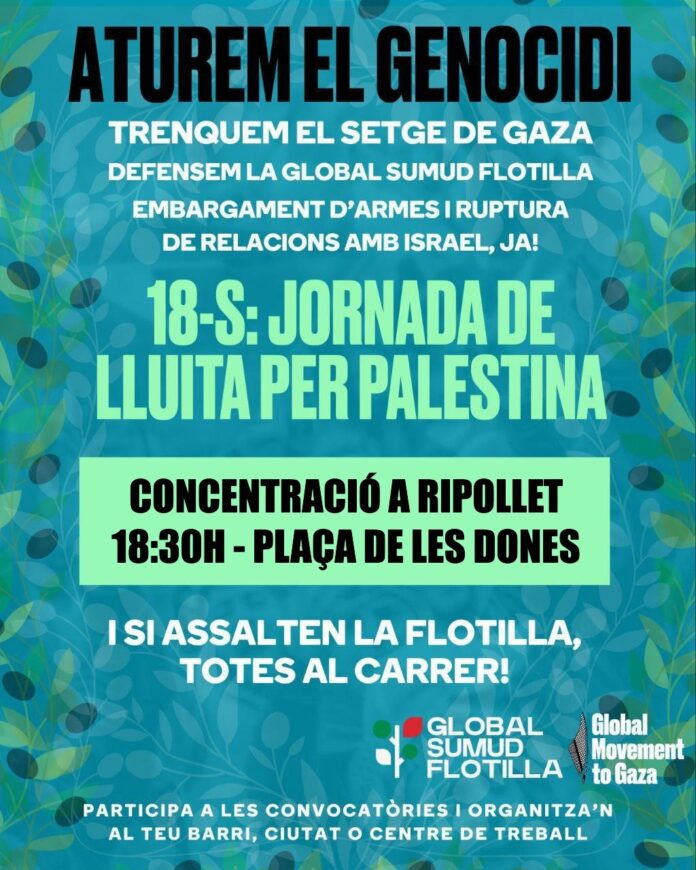 Aquest dijous 18 de setembre a 2/4 de 7 de la tarda, tindrà lloc a la plaça de les Dones una concentració de suport al poble palestí i de rebuig a l’ofensiva a la Franja de Gaza. Els convocants fan una crida a sortir al carrer en una jornada de lluita per Palestina.