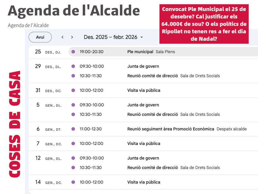 IniciActualitatCoses de Casa ActualitatSocietat Coses de Casa Per fmwripollet 07/12/2025 16 Compartir FacebookTwitterWhatsAppTelegramEmailImprimir Agenda extreta del web oficial de l’Ajuntament de Ripollet fmwripollet.cat Article anteriorUn Ripollet postapocalípticArticle següentLA CORONA D’ESPINES Articles populars Entra en vigor el Registre Nacional de Patinets Elèctrics i l’assegurança obligatòria 10/02/2026 El Voluntariat per la llengua (VxL) consolida la conversa com a eina clau per fomentar l’ús del català 10/02/2026 Presentació del llibre “1000 anys del cultiu de la vinya a Ripollet” a Cerdanyola 10/02/2026 Butlletí de notícies del dimarts 100226 10/02/2026 Veure'n més