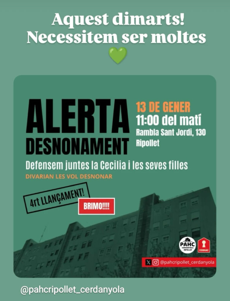 Tanmateix, en el cas de la Cecilia, el procediment ja és definitiu i tancat, fet que impedeix qualsevol mediació o suspensió del desnonament i posa de manifest, un cop més, la manca d’alternatives reals per a famílies en situació de màxima vulnerabilitat.
