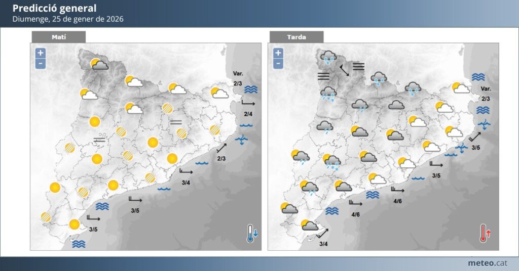 Diumenge 25 de gener, el cel es mantindrà amb intervals de núvols i núvols dispersos, amb la possibilitat d’alguna precipitació feble i puntual, tot i que no s’esperen pluges destacables. Les temperatures continuaran baixes: la màxima se situarà al voltant dels 10–11 °C, mentre que la mínima baixarà fins als 3–5 °C, sobretot durant la matinada. El vent bufarà de manera moderada i l’ambient serà fred i humit.