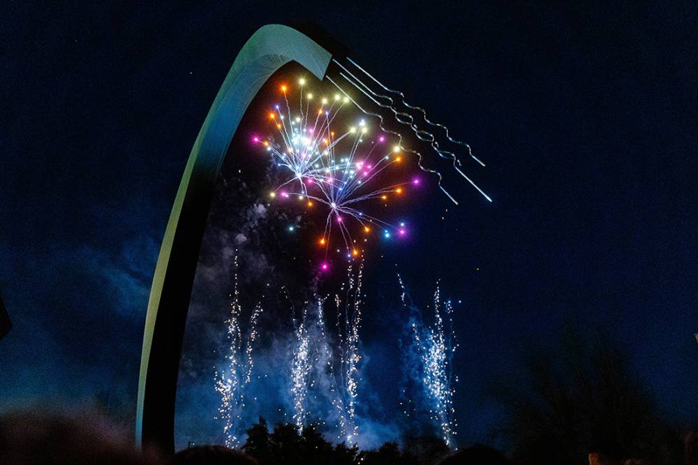 La C de l’avinguda Primavera, amb focs artificials al fons, per a la festa del 2024