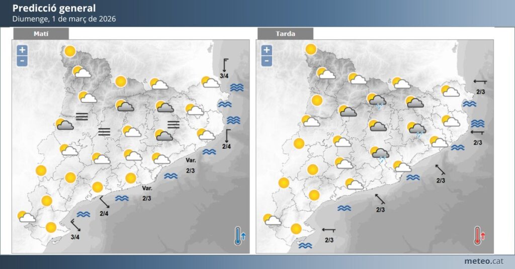 Tant diumenge 1 com dilluns 2 de març de 2026 estaran marcats per un ambient suau de finals d’hivern, amb temperatures moderades i absència de precipitacions destacables.