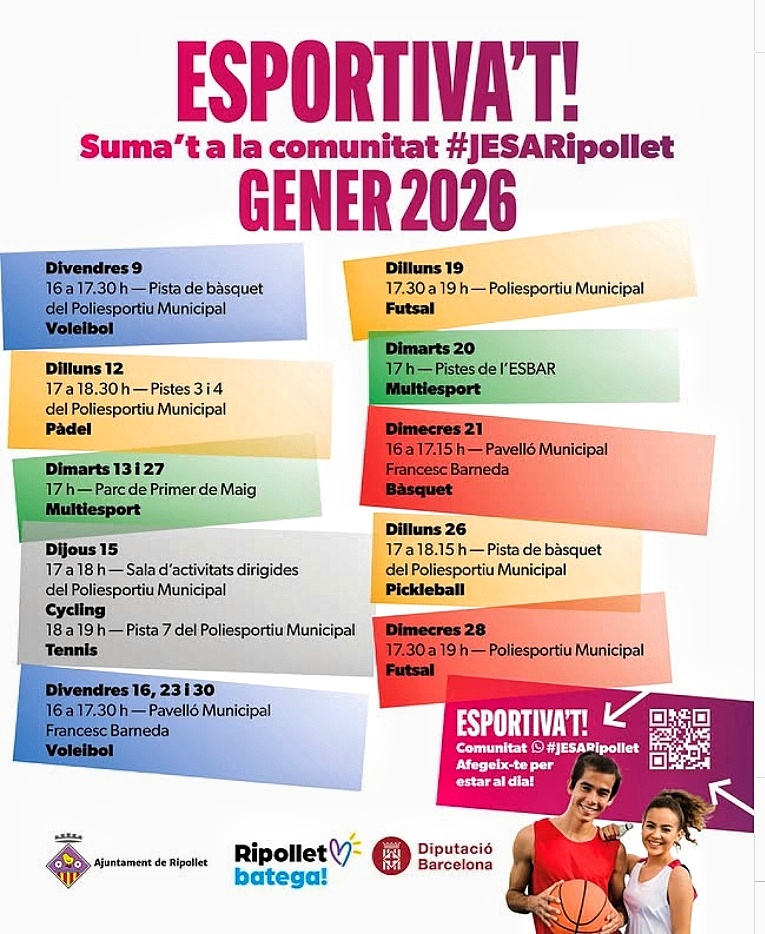 Al llarg de gener, el Poliesportiu Municipal de Ripollet i altres equipaments esportius del municipi acolliran una àmplia programació d’activitats. Bàsquet, futbol, handbol, pàdel i moltes altres disciplines esportives formen part d’una oferta pensada per fomentar la participació, la diversió i el treball en equip.
