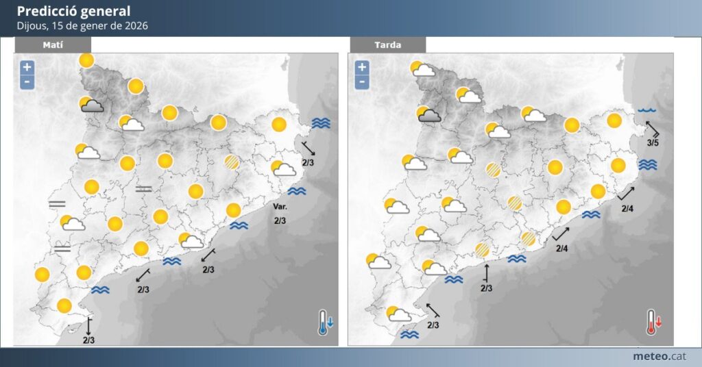 Aquest dijous 15 de gener predominaran els intervals de núvols alts i mitjans, tot i que es mantindran clarianes àmplies durant bona part del dia. L’ambient serà fred a primera hora, amb mínimes al voltant dels 5–6 °C, mentre que al migdia les màximes s’enfilaran fins als 11 o 12 °C. No s’esperen precipitacions, i el vent bufarà fluix, fet que afavorirà una sensació tèrmica relativament estable.