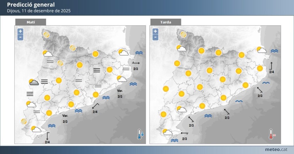 Per dijous 11 de desembre, s’espera sol entre núvols, amb una sensació tèrmica agradable. La temperatura màxima arribarà als 17 °C, mentre que la mínima baixarà fins als 8 °C a primera hora del matí. El vent bufarà fluix i no es preveu cap fenomen destacable.