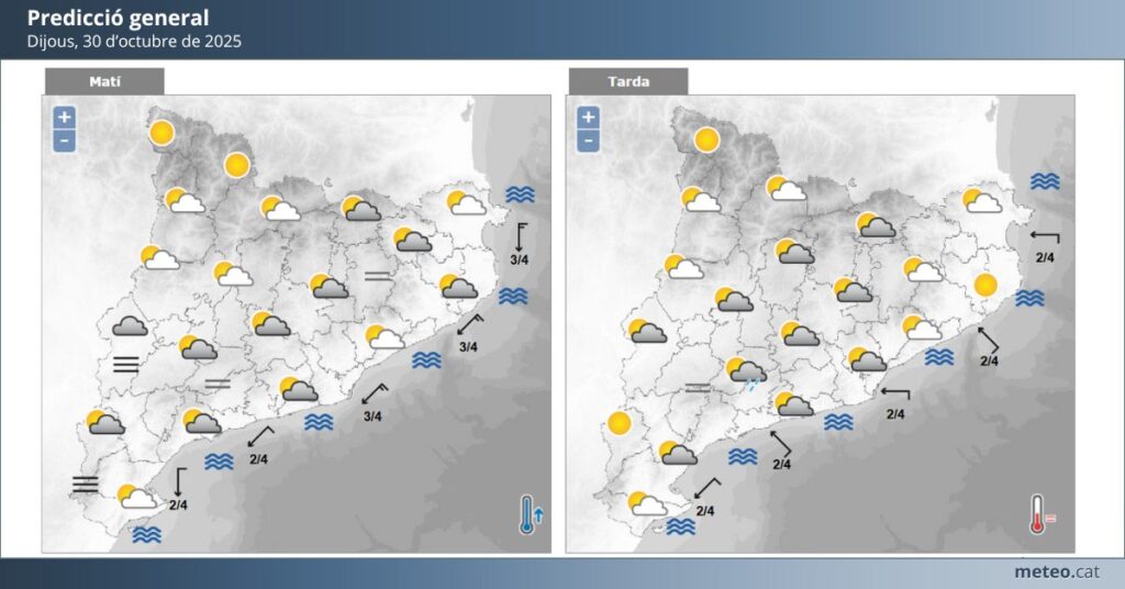 De cara a divendres 31 d’octubre, el temps continuarà tranquil però amb alguns intervals de núvols que podrien cobrir parcialment el cel durant la tarda. Les temperatures seguiran en la mateixa línia, amb màximes d’uns 22 °C i mínimes d’uns 11 °C, configurant un final de setmana suau i agradable.