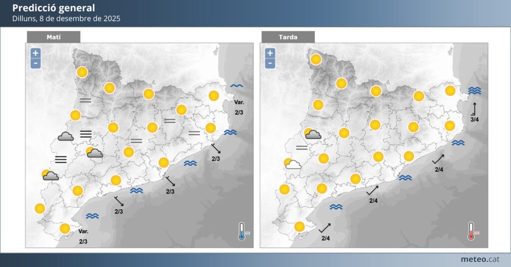 Per al dilluns 8 de desembre, s’espera un dia plenament assolellat, amb un ambient agradable i poc propi de finals de tardor. Les temperatures arribaran fins als 20 °C de màxima, mentre que les mínimes baixaran fins als 6 °C, deixant una diferència notable entre el dia i la nit. No es preveuen precipitacions ni canvis bruscos, i el vent es mantindrà feble.