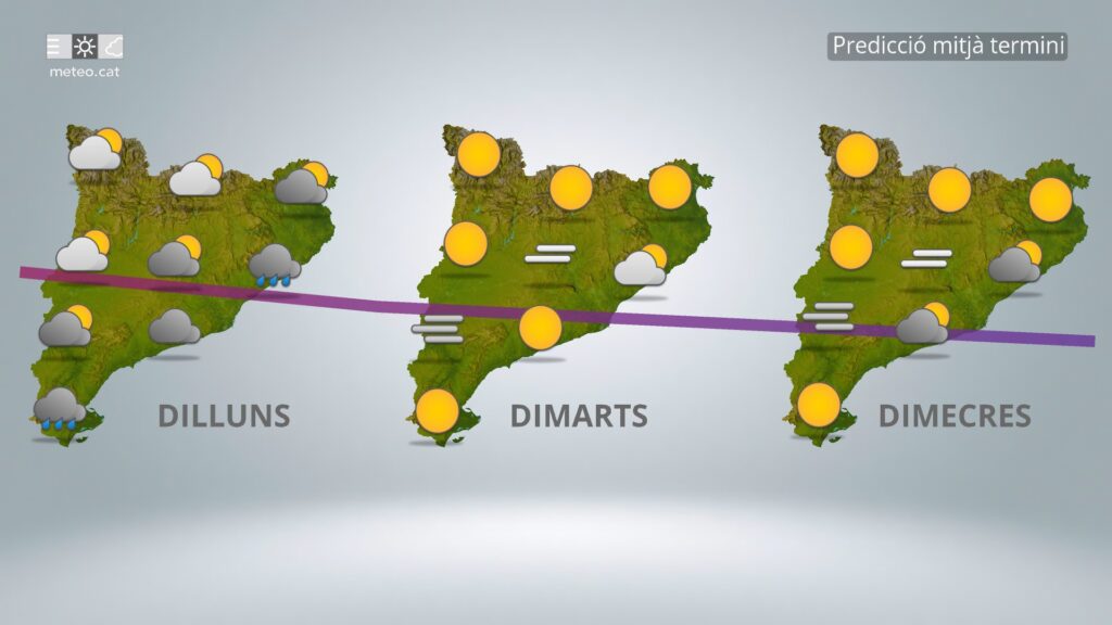 El dilluns 29 estarà condicionat per un cel majoritàriament ennuvolat, amb possibilitat de plugims febles i puntuals, sobretot durant les primeres hores del dia. Les temperatures es mantindran contingudes, amb màximes al voltant dels 14 o 15 graus i mínimes que no baixaran dels 6 o 8 graus, valors suaus per a l’època de l’any.