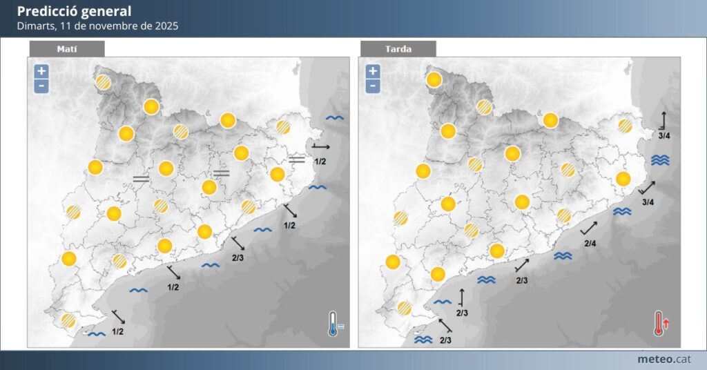 El dimecres 12 continuarà amb una tònica similar, tot i que lleugerament més suau. Els termòmetres marcaran màximes de fins a 20 °C i mínimes d’uns 10 °C. El vent bufarà feble i no s’esperen precipitacions, de manera que el temps es mantindrà estable i sec.