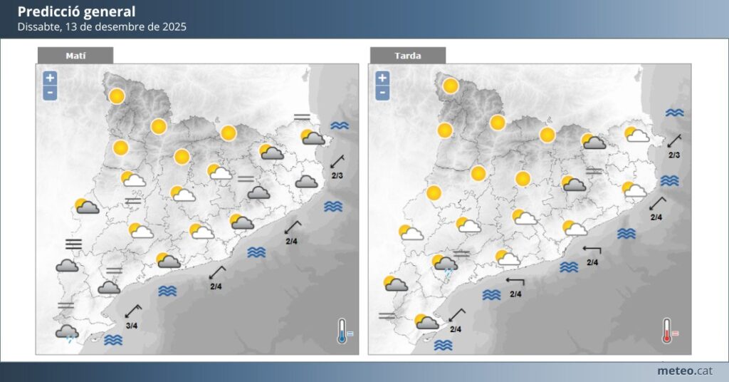 Dissabte 13 de desembre començarà amb un cel força cobert, especialment durant les primeres hores. Amb el pas del matí i el migdia s’obriran algunes clarianes que deixaran entreveure el sol, però el domini serà per als núvols. Malgrat la grisor, les temperatures seran suaus: màximes prop dels 17 °C i mínimes a l’entorn dels 6 °C. Un ambient fresc, però agradable per a activitats a l’aire lliure.