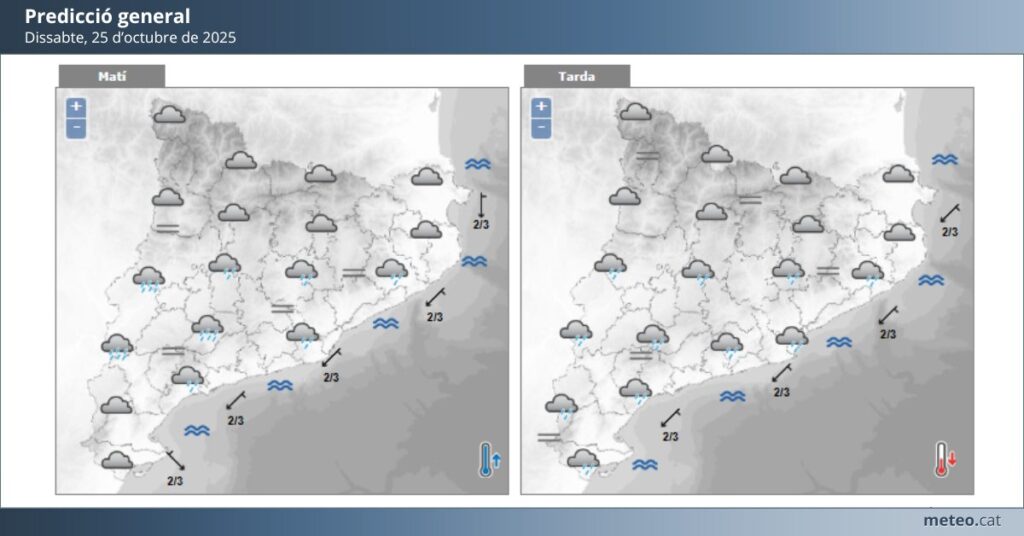 Per a dissabte 25 d’octubre, es preveu un cel majoritàriament cobert, amb intervals de clarianes durant el migdia. Les temperatures es mantindran relativament suaus, amb una màxima d’uns 21 °C i una mínima de 12 °C. Tot i els núvols, el dia serà agradable per activitats a l’aire lliure, especialment al matí.