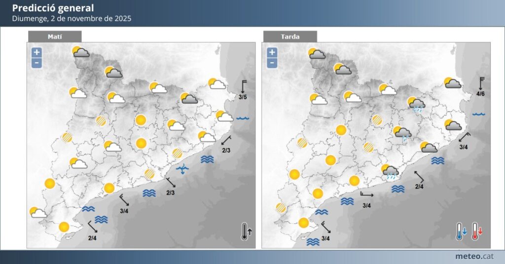 Diumenge 2 de novembre amb un temps variable, un dia marcat per xàfecs dispersos al llarg de la jornada. Tot i això, les temperatures es mantindran suaus, amb màximes al voltant dels 21 °C i mínimes d’uns 11 °C, fet que farà la jornada relativament agradable quan no plogui.