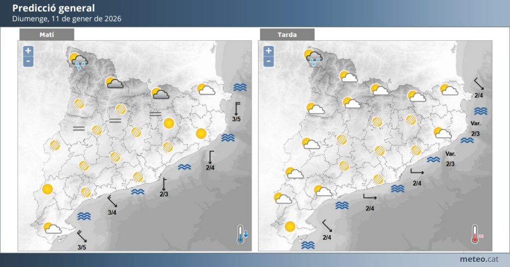 Diumenge 11 de gener es preveu un dia amb cel poc ennuvolat i intervals de núvols, però amb moments de sol abundants. Les temperatures màximes s’enfilaran fins als aproximadament 13 °C–14 °C, mentre que les mínimes rondaran els 3 °C–6 °C, fet que manté un ambient fresc però suportable durant el dia.
