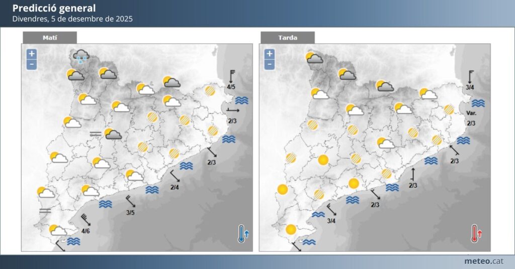 Divendres, els cels estaran parcialment ennuvolats, amb intervals de sol que deixaran una sensació força agradable a les hores centrals del dia. Tot i així, la temperatura mínima baixarà fins als 7 °C, fet que podria comportar un ambient fred a primera hora del matí i a última de la tarda. La màxima arribarà als 16 °C, i no es preveu cap episodi de vent fort ni pluja destacable.