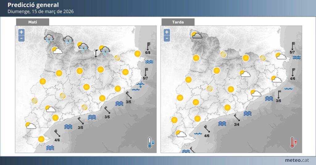 Diumenge 15 de març es preveu una jornada majoritàriament tranquil·la. El cel es mantindrà predominantment assolellat, tot i que amb alguns intervals de núvols cap al final del dia. L’ambient serà encara fresc a primera hora del matí, amb una temperatura mínima al voltant dels 4 o 5 °C. Al migdia, però, el termòmetre pujarà fins als 12 o 13 °C, amb vent fluix i sense previsió de precipitacions.