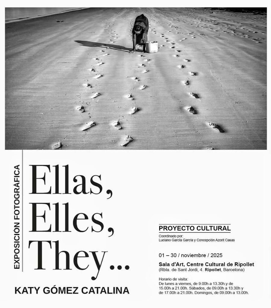 La Sala d’Art del Centre Cultural de Ripollet acull, fins al 30 de novembre, l’exposició fotogràfica “Ellas, Elles, They…”, de la reconeguda fotògrafa Katy Gómez Catalina. La mostra, organitzada per AFOCER i coordinada per Luciano García García i Concepción Azorit Casas, es va inaugurar el divendres 7 de novembre a les 18.30 h amb la presència de l’autora.