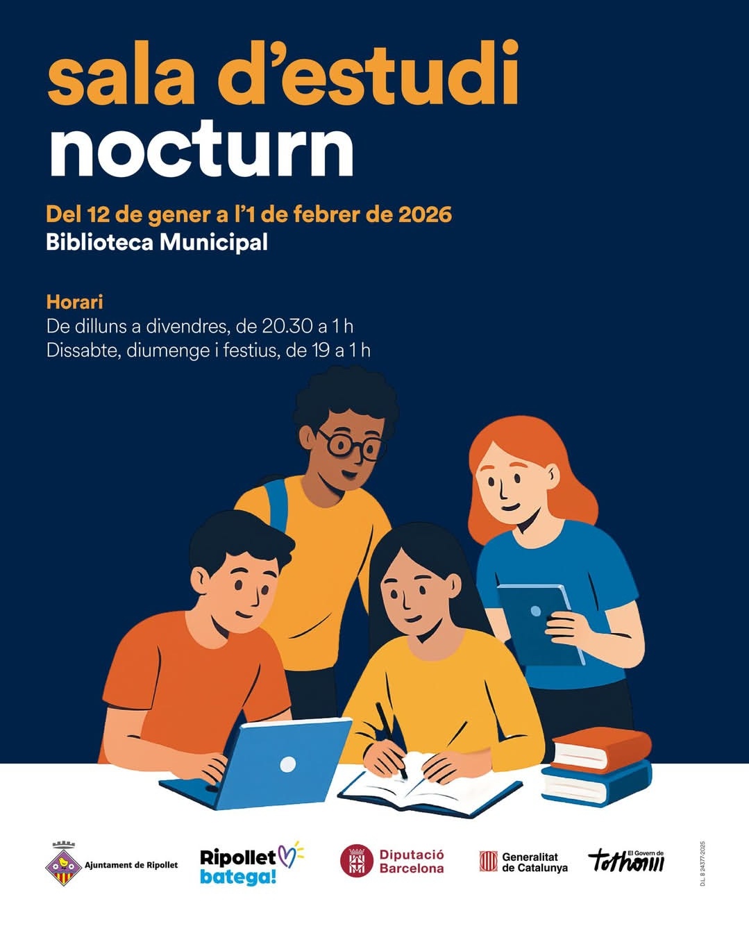 A partir del dilluns 12 de gener i fins a l’1 de febrer, podreu gaudir del servei de sala d’estudi nocturna a la Biblioteca Municipal, pensat especialment perquè pugueu preparar els exàmens amb comoditat.