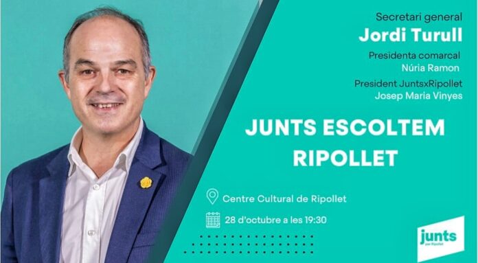 Ripollet acollirà dimarts 28 d’octubre, a les 19:30 hores, la presència del secretari general de Junts, Jordi Turull al Centre Cultural, a la rambla Sant Jordi. L’acte serà una oportunitat per “compartir un vespre de diàleg, debat i intercanvi d’idees, posant l’accent en el compromís amb Catalunya i amb la comunitat de Ripollet” diuen des de la formació independentista.
