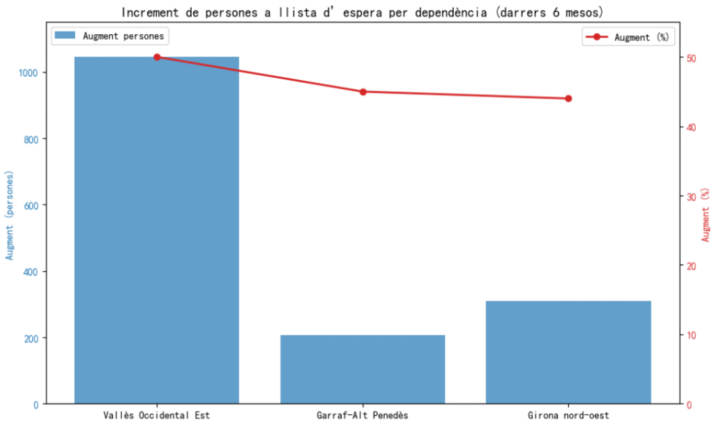 El nombre de persones que esperen la valoració del seu grau de dependència s’ha més que duplicat: l’octubre del 2025, gairebé 68.000 persones continuen a l’espera, enfront de les 25.000 del 2023, la qual cosa representa un augment del 180%.