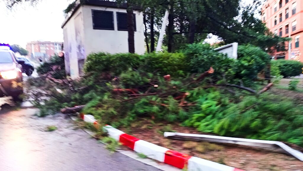 En només un quart d’hora, la pluja torrencial, acompanyada de pedra i forts vents de més de 70 km/h, va provocar danys materials importants. L’aigua va córrer rambla avall des de Pinetons i Les Vinyes fins al centre i per Collserola fins al Poliesportiu, deixant fang i mobiliari malmès.