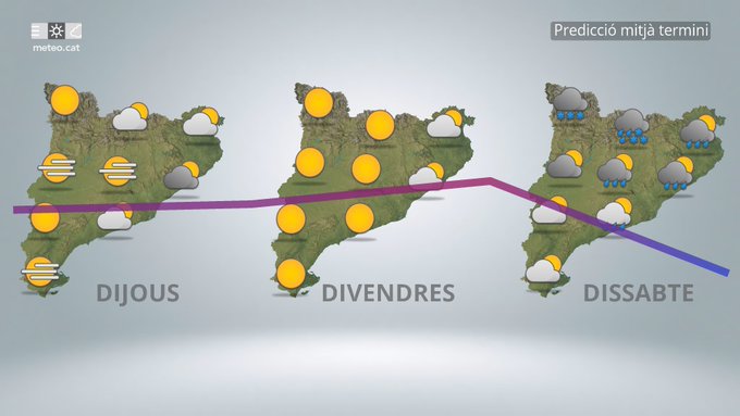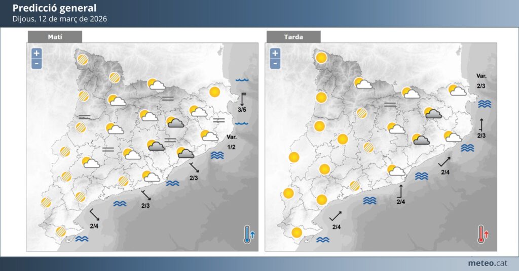 Segons les previsions meteorològiques, dijous el cel estarà majoritàriament ennuvolat o molt ennuvolat, amb la possibilitat de plugims febles o algun ruixat lleuger, sobretot durant el matí o a les hores centrals del dia. Les temperatures es mantindran relativament suaus per a l’època, amb una mínima al voltant dels 10 °C i una màxima que podria arribar als 15 °C. El vent bufarà fluix o moderat de component oest o nord-oest, deixant una sensació d’ambient fresc i humit.
