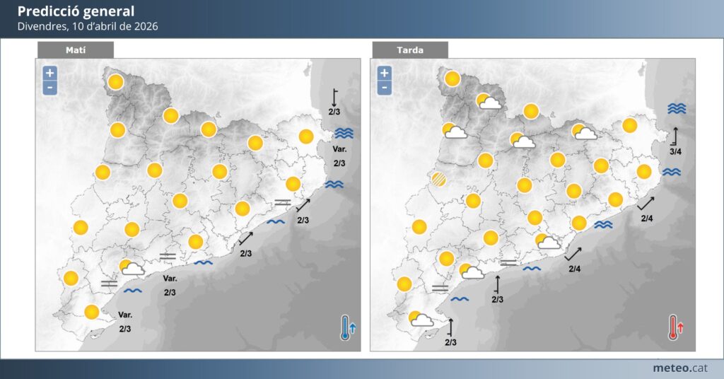 Divendres 10 d’abril començarà amb un ambient tranquil. Al matí es combinaran clarianes amb alguns núvols, i la sensació serà agradable, amb temperatures que es mouran entre els 10 i els 18 graus. A mesura que avanci el dia, però, el cel es tornarà més tapat i no es descarta algun ruixat feble a la tarda. No serà un dia passat per aigua, però convindrà no deixar el paraigua gaire lluny.