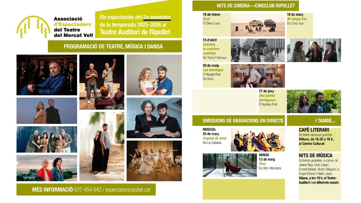 A partir d’aquí, s’obren sis mesos d’activitat continuada fins al juny, amb una programació variada i pensada per a tots els públics. Entre les cites destacades hi trobem Teatre, Dansa, Música i Cinema.