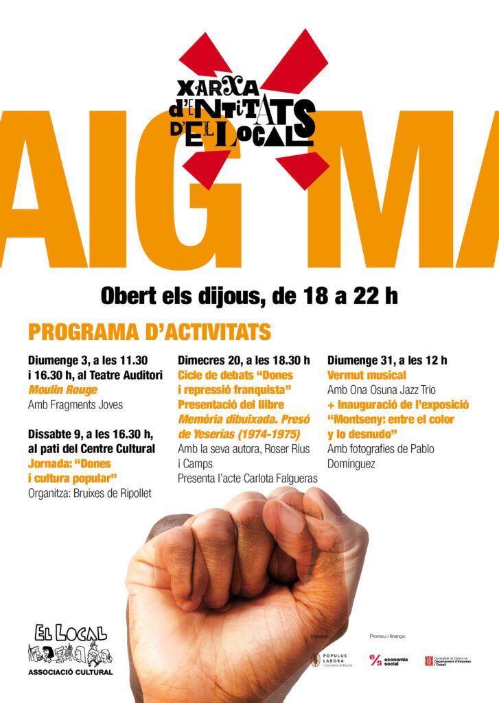 La figura de la dona és l’eix central de diverses activitats destacades d’aquest mes: 9 de maig: El pati del Centre Cultural serà la seu de la jornada “Dones i cultura popular”, organitzada per les Bruixes de Ripollet. Una cita per analitzar i reivindicar el paper femení en les nostres tradicions. El 20 de maig (18:30 h): El Local acollirà la primera sessió del cicle “Dones i repressió franquista”. L’acte comptarà amb la presència de Roser Rius i Camps, que presentarà el seu llibre Memòria dibuixada. Presó de Yeserías (1974-1975). Aquest cicle de memòria històrica tindrà una segona part durant el mes de juny.