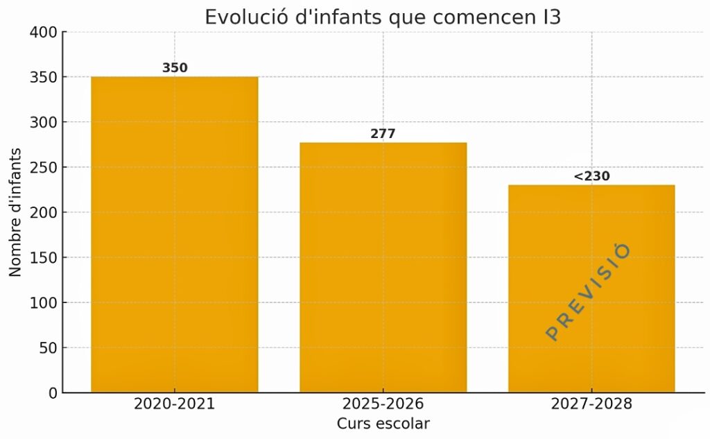 Des del Departament s’assegura que aquesta mesura és conseqüència de la situació de baixa natalitat al municipi. Dels 350 infants que van iniciar l’escolarització el curs 2020-2021, s’ha passat als 277 d’aquest curs 2025-2026, el que suposa una diferència de 73 infants i explica la reducció de línies i baixada de ràtios dels darrers anys. Aquest descens es preveu que vagi en augment i que el curs 2027-2028 s’estima que no arribaran als 230 els infants que començaran I3, el que suposa una diferència d’uns 120 infants respecte les dades d’escolarització de 2020.