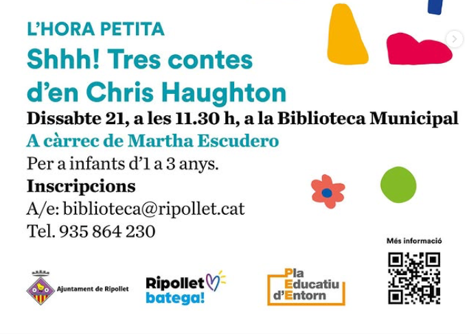 L’activitat, conduïda per Martha Escudero, s’adreça a infants d’1 a 3 anys i començarà a les 11.30 h a la Biblioteca Municipal. Les places són limitades i cal inscripció prèvia a través del correu electrònic biblioteca@ripollet.cat o bé trucant al 935 864 230.