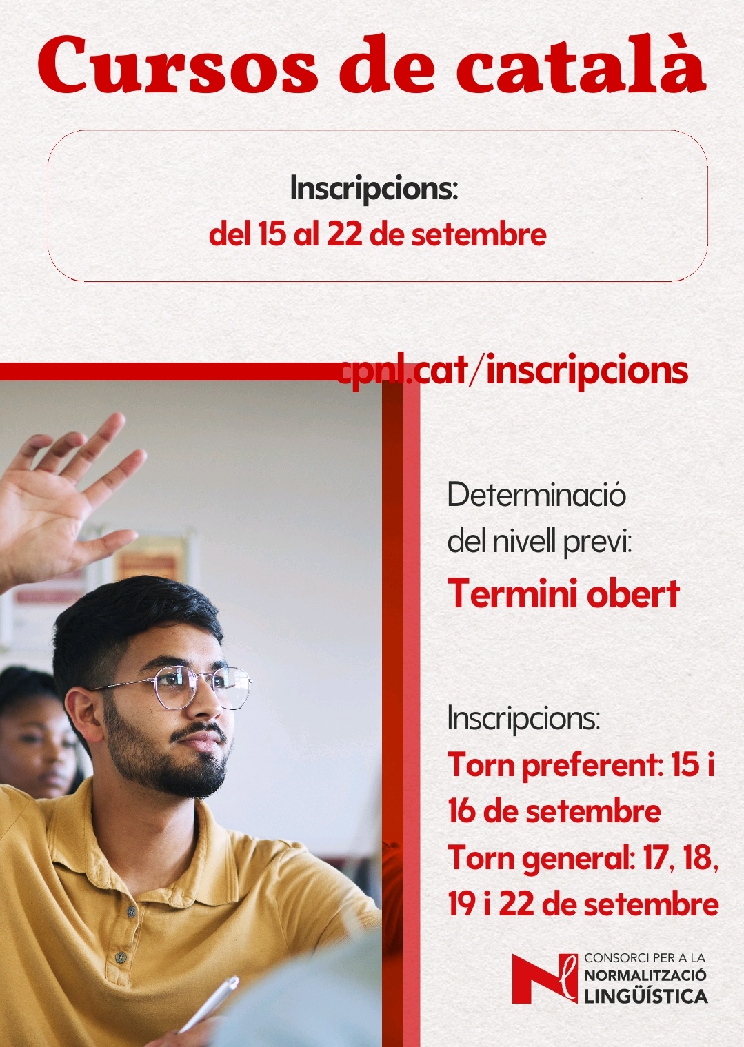 El Consorci per a la Normalització Lingüística (CPNL) ha obert un nou període d’inscripció per als cursos generals de català, que abracen tots els nivells, de l’A1 al C2. La inscripció es pot formalitzar tant en línia, a través del web inscripcions.cpnl.cat, com de manera presencial als centres del CPNL.
