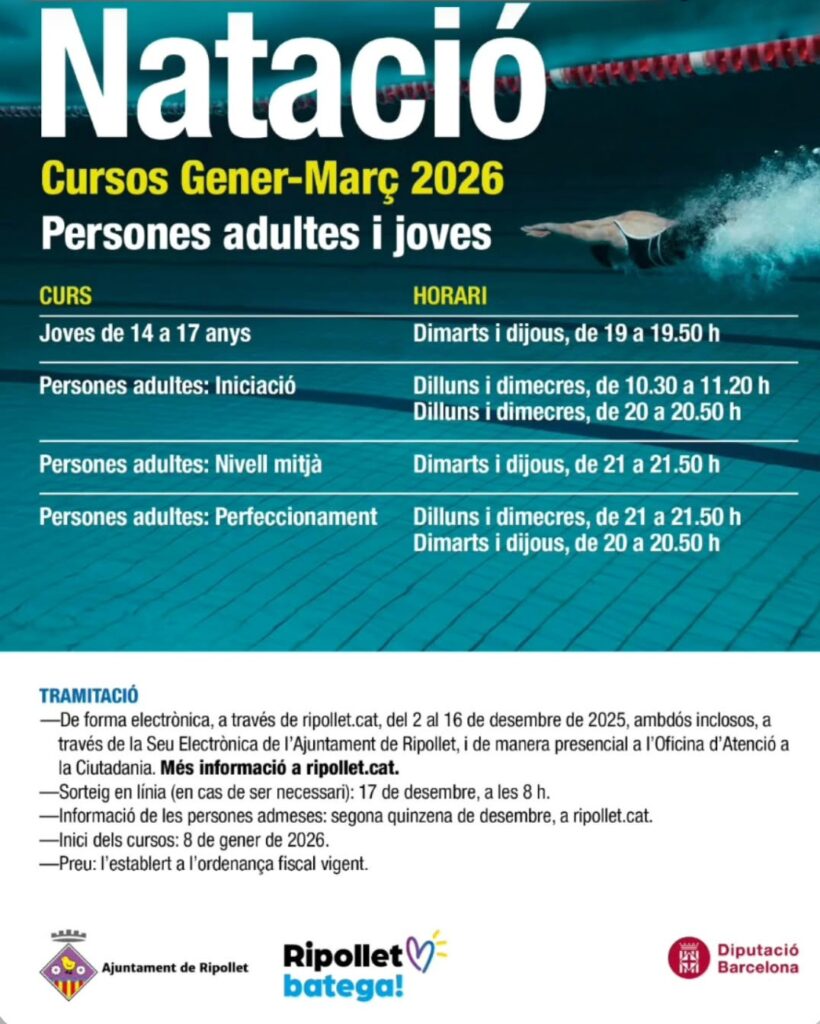 L’àrea d’Esports ha obert el període d’inscripcions per als cursos de natació per a persones adultes i joves, que es desenvoluparan a la piscina coberta entre gener i març de 2026. Les activitats es faran de dilluns a dijous, i el 8 de gener de 2026 està fixada la data oficial d’inici.