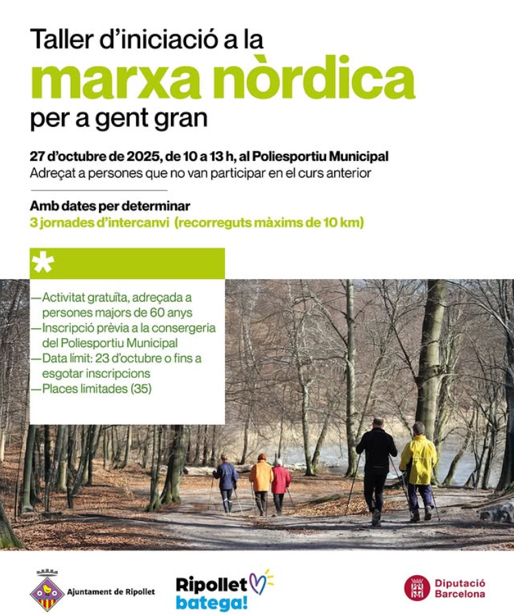 Fins al 23 d’octubre de 2025, o fins a exhaurir les 35 places disponibles, estan obertes les inscripcions per participar en el Taller d’iniciació a la marxa nòrdica, una activitat adreçada a persones majors de 60 anys que no van participar el curs anterior. A més, a les persones que ja hi van prendre part l’any passat, se les trucarà directament per informar-les.