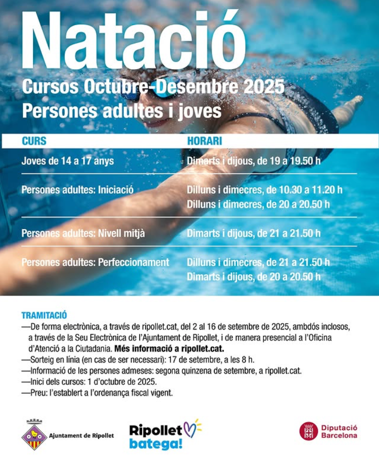 És obert el període d’inscripcions per als cursos de natació adreçats a persones adultes i joves. Les activitats es duran a terme a la piscina coberta de l’1 d’octubre al 19 de desembre de 2025, de dilluns a dijous.