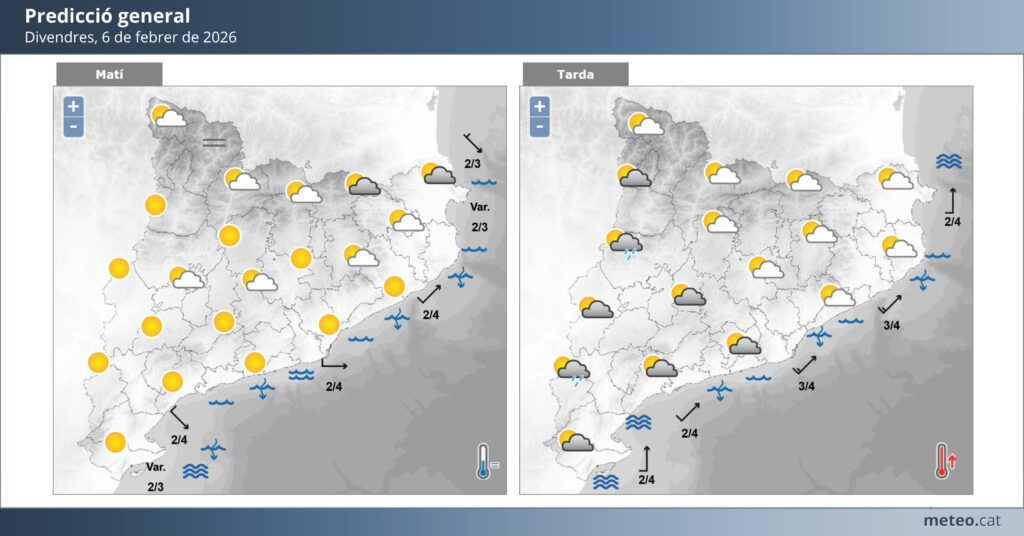 Divendres 6, el cel es presentarà poc ennuvolat o assolellat durant bona part de la jornada. No s’esperen pluges. Les temperatures màximes se situaran al voltant dels 18 °C, mentre que les mínimes baixaran fins als 8 °C a primeres hores del matí i durant la nit.