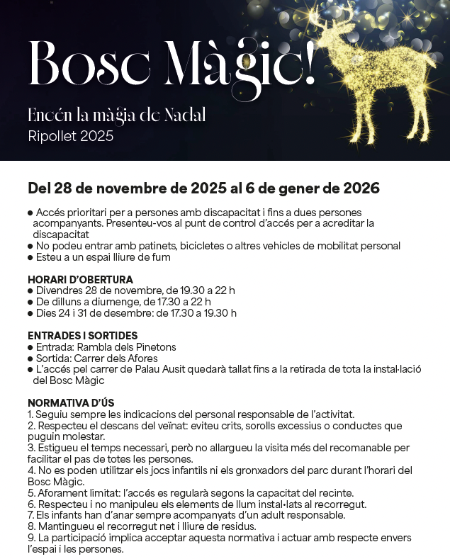 Amb aquestes normes, l’organització vol oferir una experiència segura i agradable per a totes les famílies que visitin el Bosc Màgic o participin en el “Salta per Nadal!”, activitats que cada any atreuen nombrosos infants i es consoliden com un dels punts forts de la celebració de Nadal local.