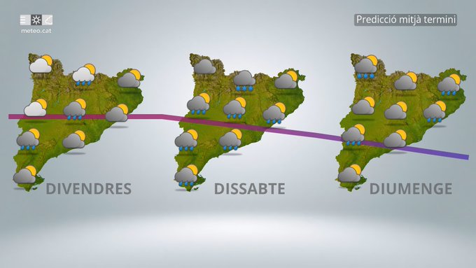 De cara a dissabte, el temps no mostrarà una millora clara. El dia es llevarà amb cel majoritàriament ennuvolat i probabilitat de pluja durant el matí, mentre que a la tarda els ruixats podrien donar una treva, tot i que els núvols persistiran. Les temperatures baixaran lleugerament, amb mínimes al voltant dels 7 °C i màximes que difícilment superaran els 14–15 °C.