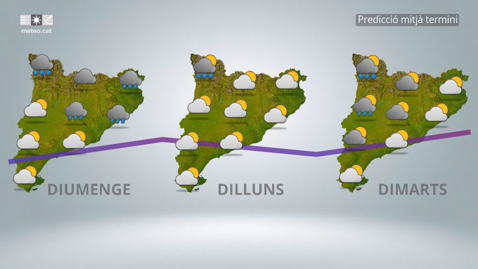 Els mapes de previsió indiquen hi haurà cel amb núvols i possibles ruixats febles al llarg del dia, especialment durant les hores centrals, tot i que alguns models mostren ratxes amb cel més estable i poca probabilitat de precipitació en certs moments de la tarda.