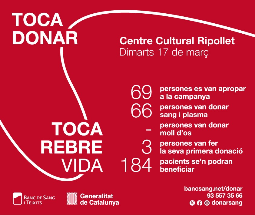 La campanya, impulsada pel Banc de Sang i Teixits amb el suport de la Generalitat de Catalunya i la col·laboració de l’Ajuntament de Ripollet, s’emmarca dins les accions periòdiques que es duen a terme arreu del territori per garantir el subministrament de sang i plasma als hospitals.