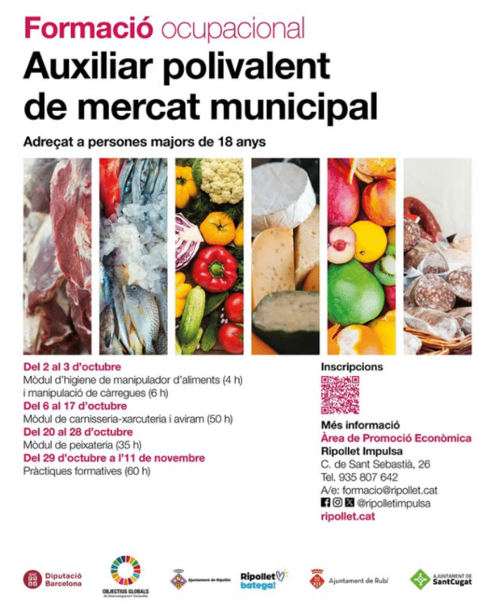 L’Ajuntament de Ripollet ha obert les inscripcions per a un nou curs de formació ocupacional destinat a persones interessades a treballar al mercat municipal. Es tracta de la formació d’Auxiliar polivalent de mercat municipal, que es durà a terme del 2 d’octubre a l’11 de novembre i està adreçada a majors de 18 anys.